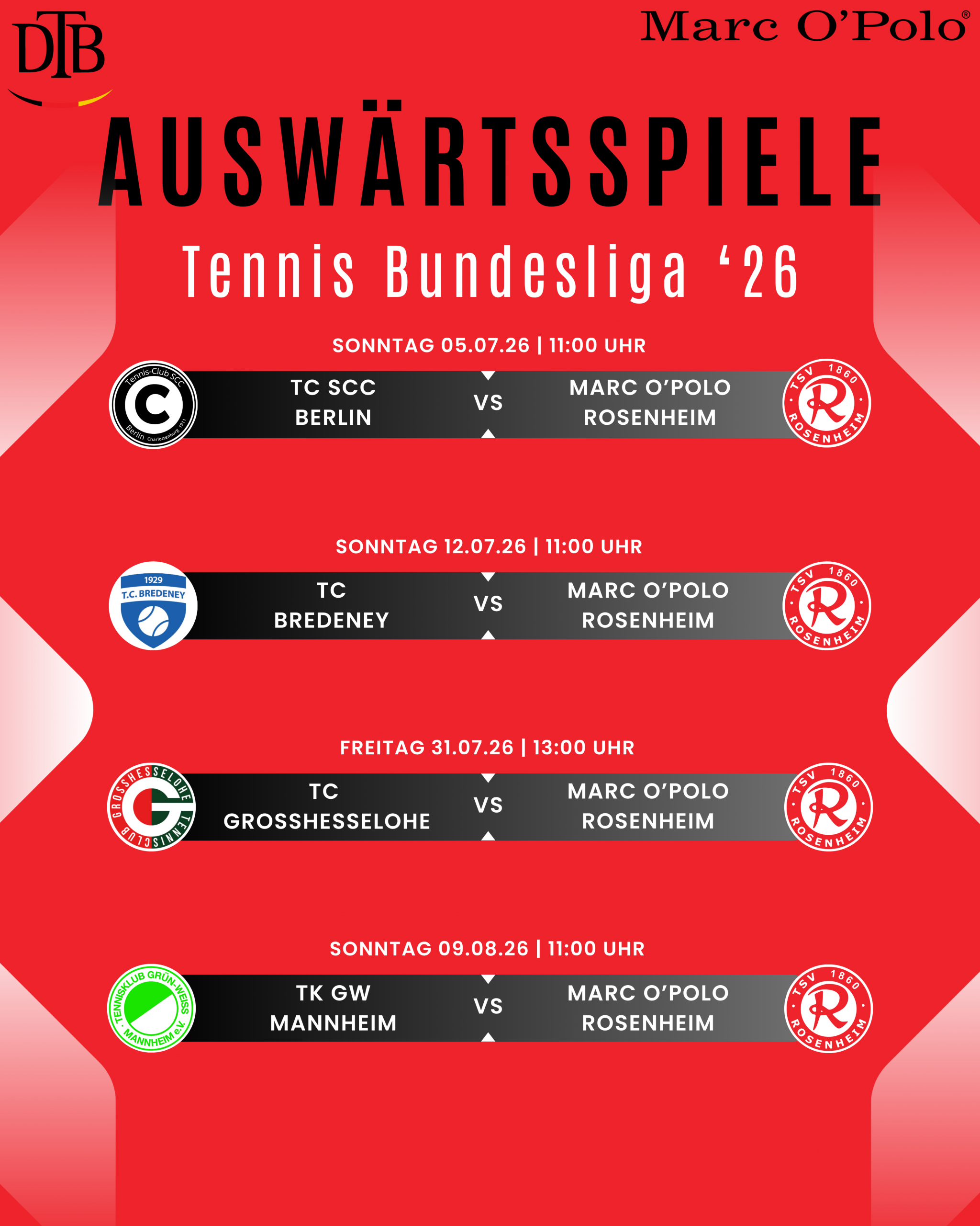 Der deutsche Tennis Bund hat den Spielplan für die 1. Bundesliga der Herren für die kommende Saison 2026 veröffentlicht. Das Team Marc O’Polo Rosenheim freut sich über fünf Heimspiele im Hexenkessel an der Pürstlingstraße und vier spannenden Auswärtsfahrten.