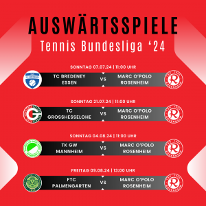 Unser Derby gegen den TC Grosshesselohe findet diese Saison in München statt. Wir bauen auf zahlreiche Mitreisende für einen ereignisreichen Auswärtssonntag. Darüber hinaus freuen wir uns auf ein Wiedersehen auf der Anlage des TK GW Mannheim und spielen das erste Mal in Frankfurt beim FTC Palmengarten.